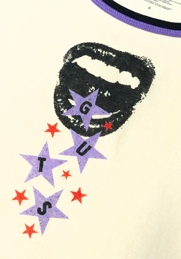 Step into your emotional era with the GUTS Ringer T-Shirt in Natural, a retro-inspired piece that blends vintage style with Olivia Rodrigo’s fearless energy.